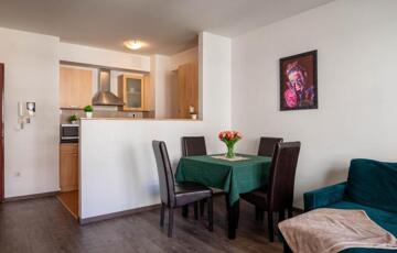 mosógép, hűtő-fagyasztó, mosogatógép, mikrohullámú sütő, sütővel ellátott tűzhely, étkezőasztal 4 székkel