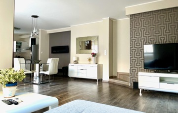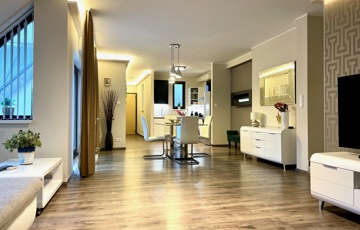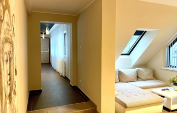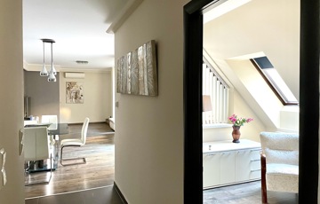 Built in 2014 as a penthouse extension, the apartment features a minimalist design, high-quality materials, and a peaceful, elegant atmosphere.
