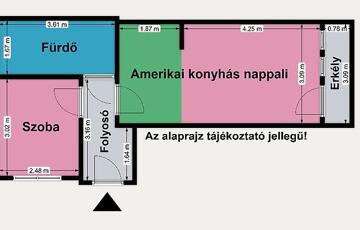 Az ingatlan amerikai konyhás nappaliból, külön hálószobából és fürdőszobából áll, jól átgondolt, praktikus elrendezéssel. A világos nappalihoz kapcsolódó erkély kellemes pihenőhelyet kínál.
