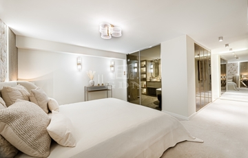 A felső szintre elegáns lépcső vezet, ahol egy privát hálószoba saját fürdővel, vitrines gardróbfal és galériaszerű közlekedő kapott helyet.
