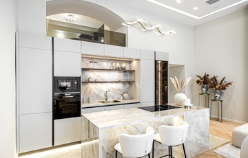 A nappali központi eleme a Scavolini konyha és a látványos médiafal, amely tökéletesen illeszkedik az otthon kifinomult stílusához.