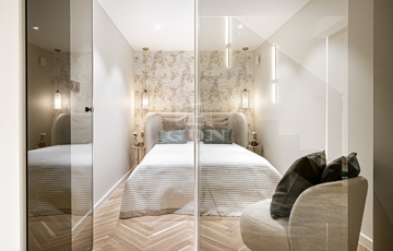 A két szintet 20 cm vastag vasbeton födém választja el, így a lakás nemcsak esztétikailag, hanem műszakilag is kifogástalan. A 4,65 méteres belmagasság tágas, levegős atmoszférát teremt, amelyet a gondosan megválasztott anyagok és színek tovább fokoznak.