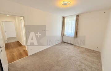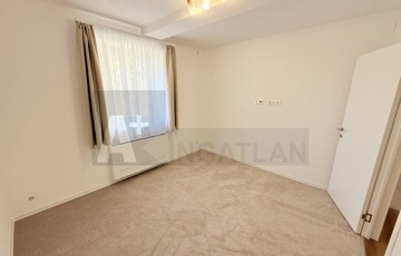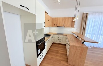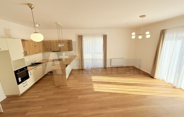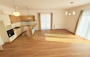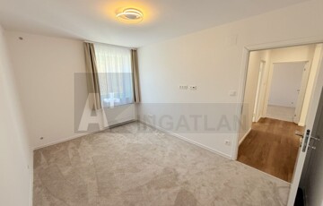Kulcsra kész előtti állapot : új konyhabútor , háztartási gépekkel , a szobákban padlószőnyeg