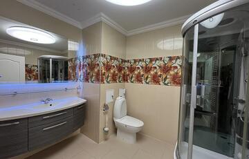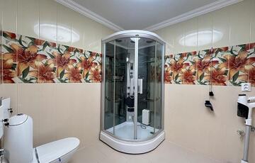A fürdőszoba új burkolatot kapott, zuhanykabinos. A mosógép be-és kiállása is ebben a helyiségben lett kialakítva.