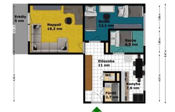Nappali (18,3 nm), 2 szoba (12,1 és 6,3 nm), konyha (7,6 nm), fürdő (2,7 nm), WC (0,8 nm) és előszoba (11 nm) és erkély (5 nm).