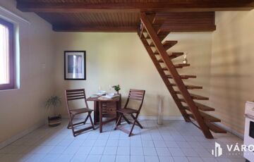 Az alsó szinten konyha és étkező került kialakításra, külön helyiségben a zuhanyzó és wc (teraszon keresztül megközelíthető), a felső szinten egy nagy szoba került kialakításra, mely egy fa lépcső segítségével megközelíthető.