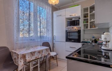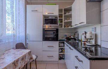 A modern, teljesen felszerelt konyha – beépített sütővel és főzőlappal – praktikus és hangulatos tere a mindennapi főzésnek.