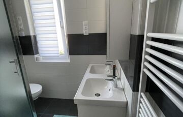Az előszobából nyílik két külön bejáratú szoba, a konyha–étkező, a mosókonyha, a zuhanyzós fürdőszoba kétállású mosdóval és WC-vel, valamint egy külön WC is.