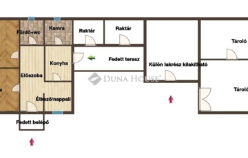 Kialakítása: 2 tágas utcafronti szoba, közlekedő, étkező, konyha, fürdő+wc, kamra, tágas fedett terasz. További raktár és műhely az udvaron, tároló és gépkocsibálló.