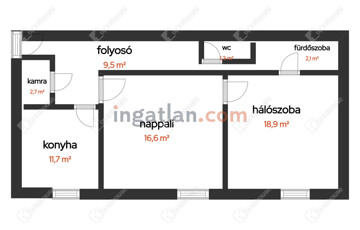 A lakás két tágas szobával, külön konyhával, fürdőszobával, külön WC-vel, kamrával, közlekedővel, rendelkezik.