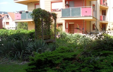 A lakás ablakai és erkélye a ház gondozott, örökzöldekkel és virágokkal beültetett belső kertjére néznek, amelyet kertész ápol. A kert zárt és teljesen védett, így csendes, nyugodt környezetet biztosít.