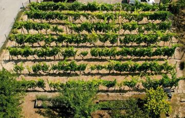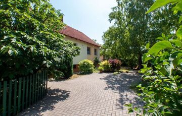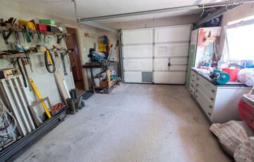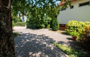A parkolás megoldott: 22 m²-es garázs és plusz 55 m² beálló áll rendelkezésre. A pince további tárolást ad. A kert rendezett, gyümölcsfákkal, szőlővel; az öntözést 18 m³-es esővíztározó támogatja.