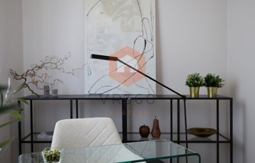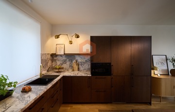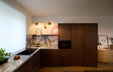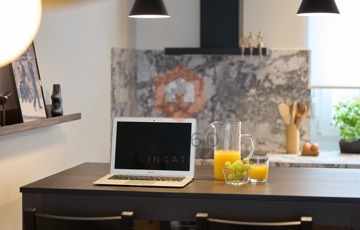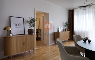 -amerikai konyhás tágas, napfényes nappali, konyhapult teljesen gépesített, indukciós főzőlappal, sütő, mikrohullámú sütő, páraelszívó, hűtő, mosogatógép, kombinált mosó-szárítógép