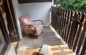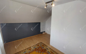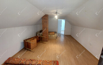 Emelet: egybenyitott, de könnyen két szobára osztható helyiség + nagy erkély.