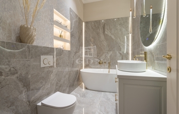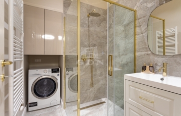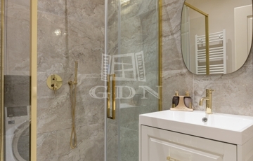 A fő hálószobához látványos kádas, bidés fürdőszoba, a másikhoz modern, üvegfalas zuhany tartozik. Külön vendég WC.