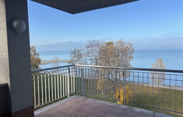 A 16 nm-es terasz fedett, örök panorámás a Balatonra.