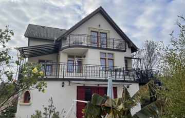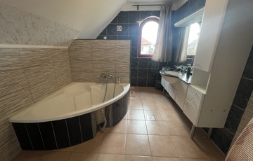 Az emeleten 4 hálószoba, egy fürdőszoba WC-vel, illetve két szobához panorámás erkély tartozik – csodás kilátással a környező hegyekre, valamint részpanorámával a Balatonra.