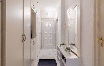 A klimatizált lakás előszobájában nagy méretű beépített gardróbszekrény, a közlekedőben szintén beépített szekrény található.