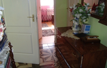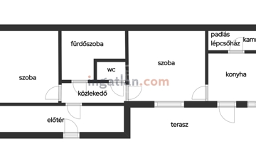 Az első bejáratnál egy hosszúkás előszoba van, melyből egy közlekedőn át nyílnak a szobák, a fürdő és a WC. A nappali mögött található a konyha, ahonnan a teraszra nyílik a hátsó ajtó.