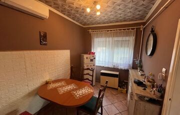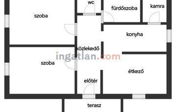 Elosztása:-előtér,közlekedő, 2 külön bejáratú nagy szoba, konyha, étkező, kamra, fürdőszoba, wc.