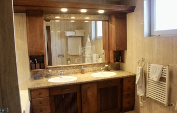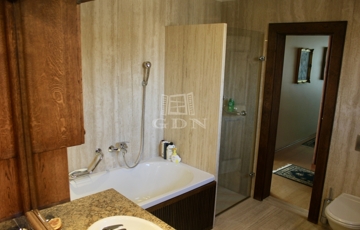 A ház belső tereit magas minőségű anyagok és megbízható műszaki megoldások jellemzik: a fürdőszobákban Laufen szaniterek, a közlekedőkben és vizes helyiségekben gránit burkolatok, míg a szobákban parketta és laminált padló található. A tölgyfából készült beltéri ajtók, a konyhabútor, a lépcső és a beépített gardróbszekrények egyedi kivitelezésűek. A földszinti nappaliban beépített kandalló és stílusos bárszekrény pedig tovább erősíti az otthon meleg, elegáns hangulatát.
