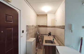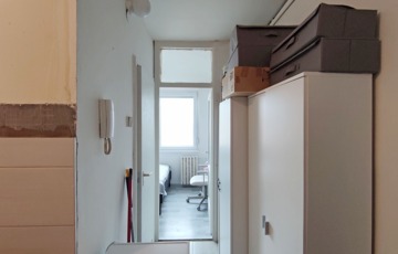 A több ponton záródó, korszerű biztonsági bejárat ajtón keresztül jutunk a világos lakásba. Balra találjuk a jelenleg éppen felújítás alatt lévő konyhabútoros, járólappal és csempével burkolt konyhát. A konyhával szemben a közlekedő jobb oldalán a 18 nm-es, laminált parkettás, nagyon világos nappalit találjuk, thermo-üveges, redőnyös, szúnyoghálós, műanyag ablakokkal, lemezradiátorokkal. A nappaliból kilépve a közlekedőből balra, szemben a kisebbik, 5,5 nm-es, laminált parkettás hálószobát találjuk, mely szintén nagyméretű hőszigetelt, redőnnyel szerelt ablakos, és kellően világos. A közlekedőből jobbra nyílik a WC-s, modern akryl kádas, járólapos és csempével burkolt fürdőszoba.