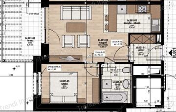 A meghirdetett földszinten található 42,40 nm-es lakásban amerikai konyhás nappali, szoba, fürdőszoba, előtér található. A nappaliból 8,76 nm-es terasz és 21,45 nm-es kertkapcsolat nyílik.