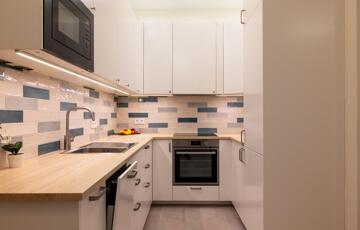 Konyhája gépesített (mosogatógép, mikró, hűtő).