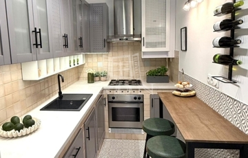 Önálló konyha, modern beépített gépekkel (sütő, gázfőzőlap, magas hűtő, mosógép)