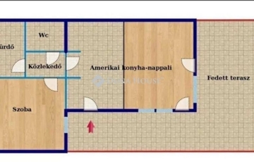 A lakás elrendezése amerikai konyhás nappali + 1 hálószoba, fürdőszoba, külön WC, valamint egy fedett terasz és saját, intim kertrész.