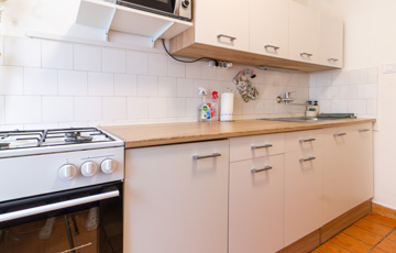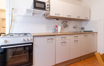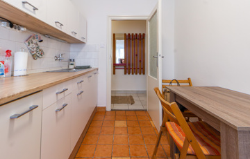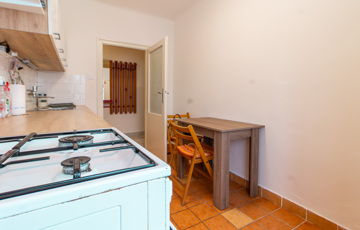 A konyha felszereltségéhez tartozik hűtő-fagyasztóval, gáztűzhely-sütővel, mikrohullámú sütő, evőeszközök, lábasok stb., valamint étkezőasztal székekkel. A konyhából egy praktikus spájz is nyílik.