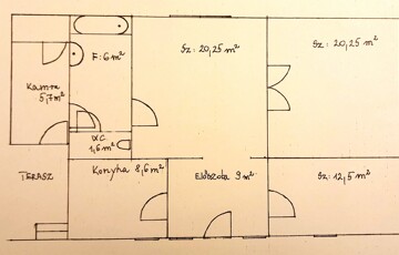 - három szoba (20,25 m²; 20,25 m² és 12,5 m²),