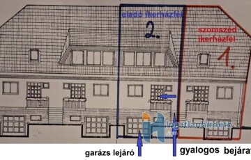 Az eladó ikerházfél egy helyrajzi számon van a szomszédos másik ikerházfél résszel, melyet ügyvéd által ellenjegyzett használati megállapodás szabályoz (külön közművek, mérőórák, saját kert).