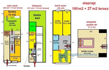 Az ikerházfél 195 m2-es + 2 db 13 m2-es terasz és külön KERT tartozik hozzá.