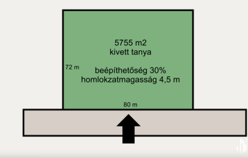 A fenyőerdővel körülvett telek mérete 5755 m2, amely maximális beépíthetősége 30%, lakóépület építése esetén 4,5 m a maximális homlokzat magasság. Az ingatlanra a villany bevezetésre került.