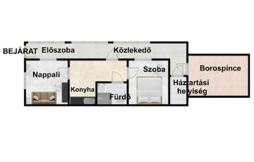 -összesen 85nm-es( konyha, fürdőszoba, 1 nappali, 1 lakószoba, előszoba, közlekedő, háztartási helyiség és egy borospince)