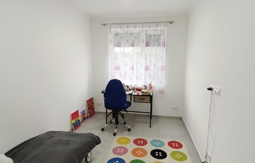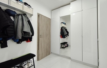 A házban két fürdőszoba és két WC, spájz, valamint mosókonyha is található. A burkolat járólap, a fűtést pedig elektromos padlófűtés biztosítja.