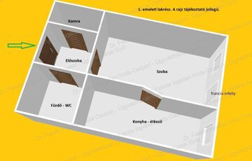 alul nettó 29 nm: előszoba, konyha, fürdő- WC, és egy hálószoba (belmagasság 2,65 m)