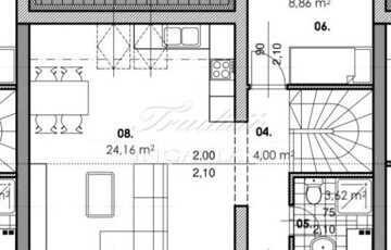 Emelet: amerikai konyhás nappali 24,16 m2, hálószoba 10,35 m2, hálószoba 8,86 m2, zuhanyzó 3,62 m2, közlekedő 4 m2
