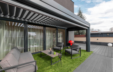 - Fedett, elektromosan mozgatható pergolás terasz (20 m²)