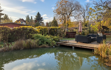 - Fürdésre és horgászatra is alkalmas kerti tó vízeséssel, sziklakerttel