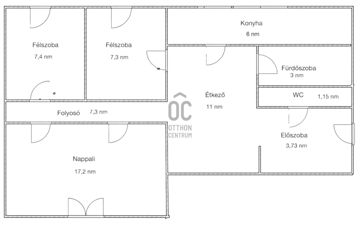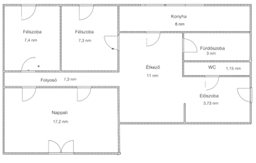 - Elrendezés: nappali/hálószoba, étkező, konyha, két félszoba, kamra, előszoba, külön fürdő és WC