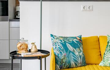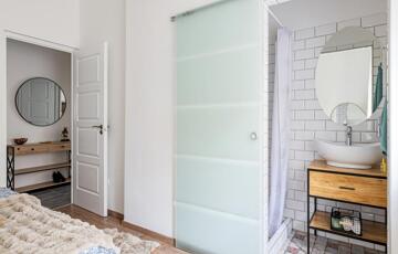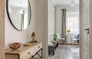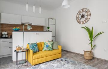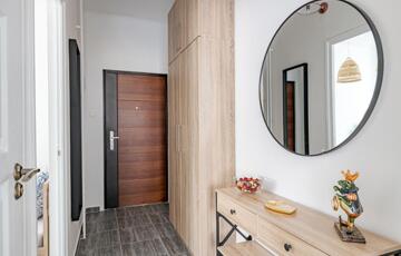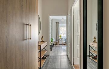 Már a belépéskor barátságos előszoba fogad, innen nyílnak a lakás jól átgondolt helyiségei. Szemben egy amerikai konyhás jellegű nappali található, ahonnan a nagy ablakoknak köszönhetően szép, délnyugati fény árad be. Jobbra kapott helyet a különálló WC kézmosóval, valamint a hálószoba, amelynek ablakai egy csendesebb, északkeleti irányba néznek. A hálóból elegáns üveg tolóajtón át jutunk a privát, zuhanyzós fürdőszobába.