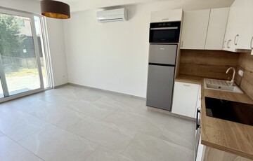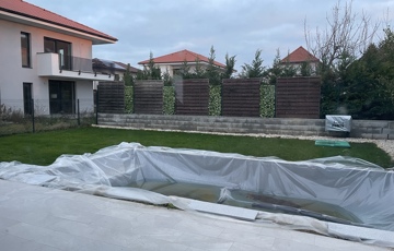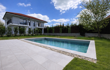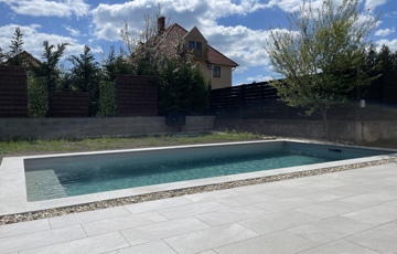 A nappaliból kilépve vár a 20 m2-es terasz, amely közvetlen kapcsolatot biztosít a kerttel és a 24 m2-es, fűthető medencével – tökéletes helyszín a pihenéshez, egész szezonban.