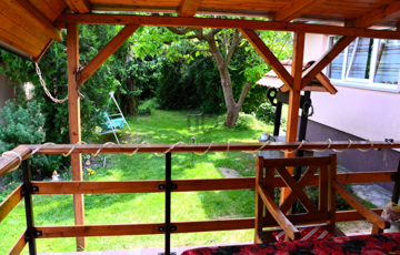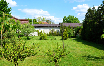 A kertje rendezett, karbantartott. Többféle gyümölcsfával, virágokkal, bogyós termésű bokrokkal, szőlővel lett betelepítve.