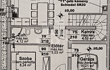 földszint: amerikai konyhás nappali, spájz, hálószoba, fürdőszoba mosdóval, közlekedő, garázs.
