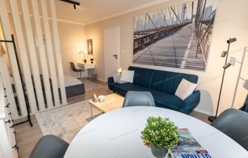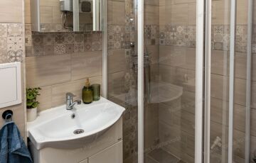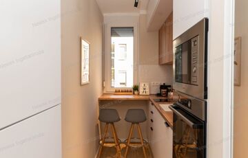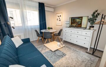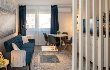 Ebben a felújított modern lakásban, jó elosztásban használhatja a 2 külön hálószekciót, a divatos térelemekkel határolt, de nyitott érzetű nappalit, az igényes zuhanykabinos fürdőszobát, valamint reggeliző sarokkal ellátott, teljesen felszerelt konyhát, az elektromos sütő és főző berendezéseket, a jégadagolós hűtőt, mely a külön nyíló kamrában került elrejtésre.