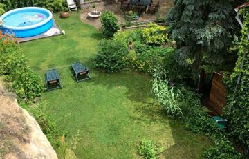 <p>The house has a unique, rustic style with natural materials and a cozy, warm atmosphere. At the end of the garden, an imposing rock wall serves as a boundary, providing a distinctive backdrop and completely blocking the view. The ancient-looking rock creates a unique atmosphere: it offers a natural experience, intimacy, and a spectacular decorative element all at once. The rock wall is stable, secure and provides an excellent microclimate for the garden, allowing the vegetation to thrive around it. The plot features cozy outdoor relaxation areas, terraces, a summer kitchen with an oven and barbecue, and a swimming pool area.</p>
