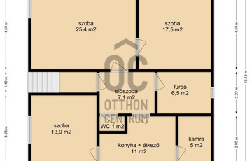 3 tágas szoba, konyha-étkező, fürdőszoba, WC, kamra és előszoba.