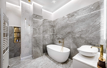 Ez az otthon nem csupán felújított – új szintre emelték. A teljes gépészet cseréje után designer csillárok, chevron mintás tölgyfa parketta, minőségi szaniterek és elegáns burkolatok tették teljessé a megjelenést. A 3,30 m-es belmagasság és a gondosan megkomponált enteriőr azonnal lenyűgöz.